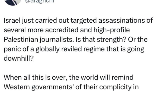 پیام سید عباس عراقچی وزیر امور خارجه در شبکه ایکس در واکنش به ترور خبرنگاران فلسطینی توسط رژیم صهیونیستی
