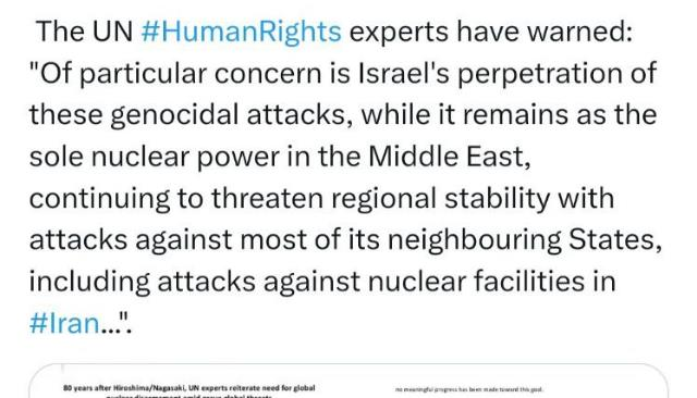 پیام سخنگوی وزارت امور خارجه در شبکه ایکس راجع به هشدار گزارشگران حقوق بشر سازمان ملل در مورد مشابهتهای نسلکشی در فلسطین با بمباران اتمی هیروشیما و ناگاسکی در سال ۱۹۴۵ میلادی، و هشدار شدید آنها نسبت به حملات رژیم صهیونیستی علیه اغلب کشورهای مجاور از جمله ایران