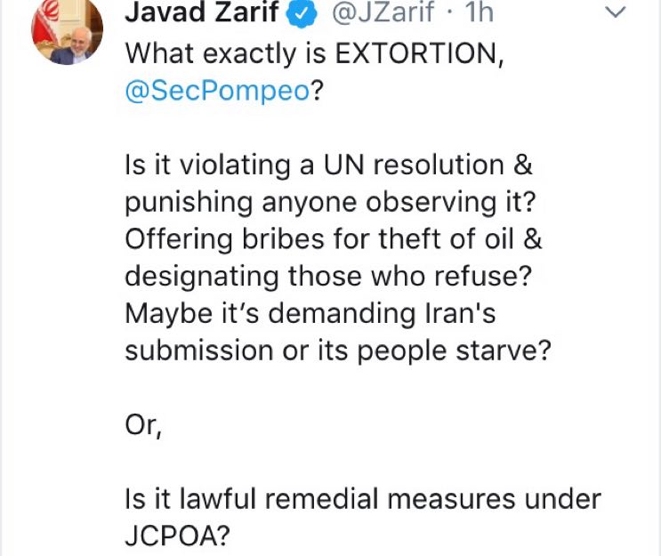 دکتر ظریف خطاب به همتای آمریکایی: آقای پمپئو، اخاذی دقیقاً چیست؟