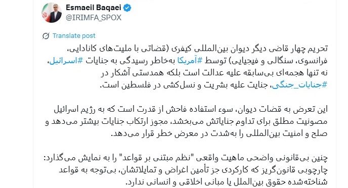پیام سخنگوی وزارت امور خارجه در شبکه ایکس: اقدام وزیر خارجه آمریکا در تحریم چهار قاضی دیگر دیوان بین‌المللی کیفری، همدستی در نسل‌کشی و کشتار فلسطینیان است.