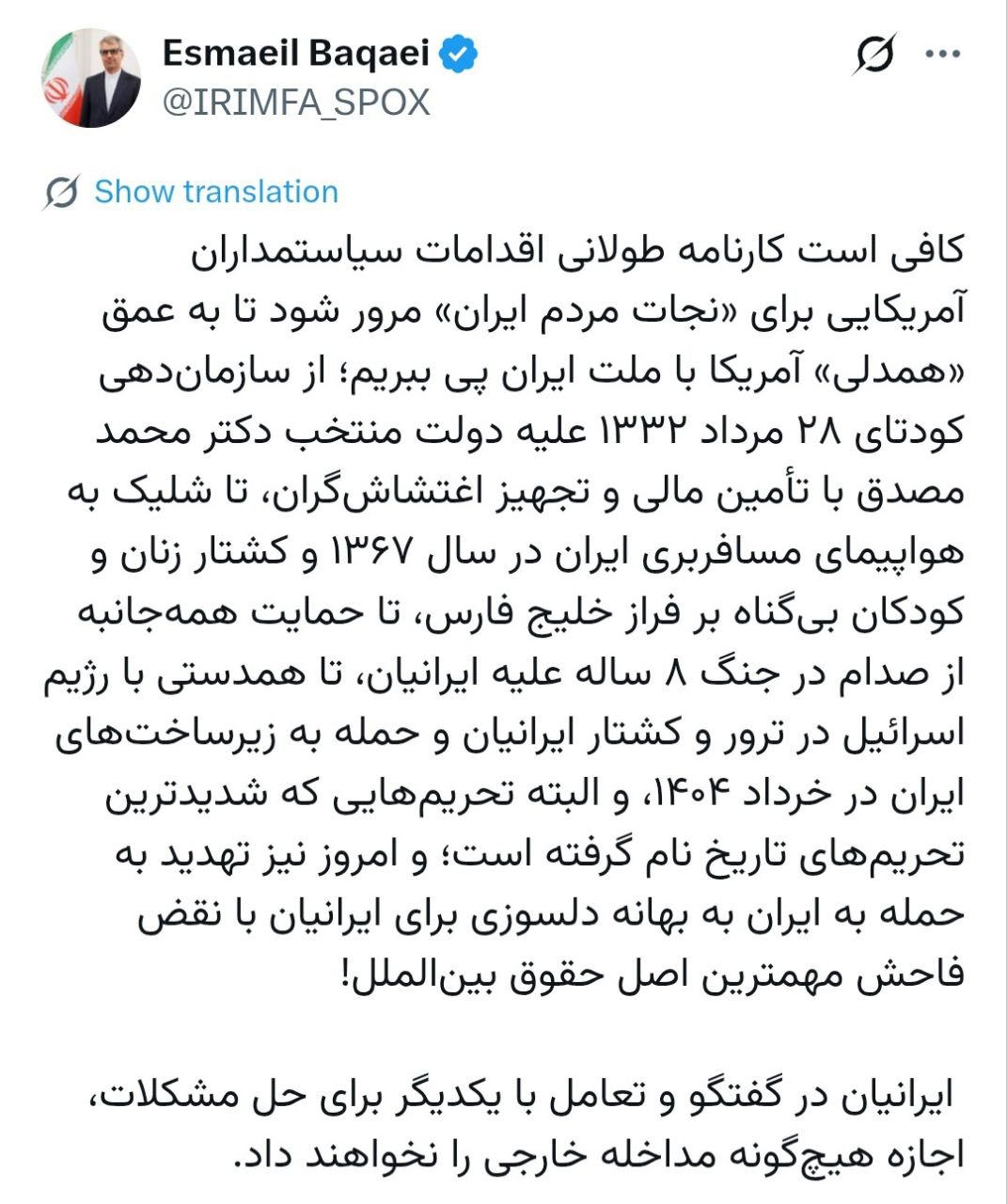 اسماعیل بقائی سخنگوی وزارت امور خارجه در پیامی در شبکه ایکس نوشت: