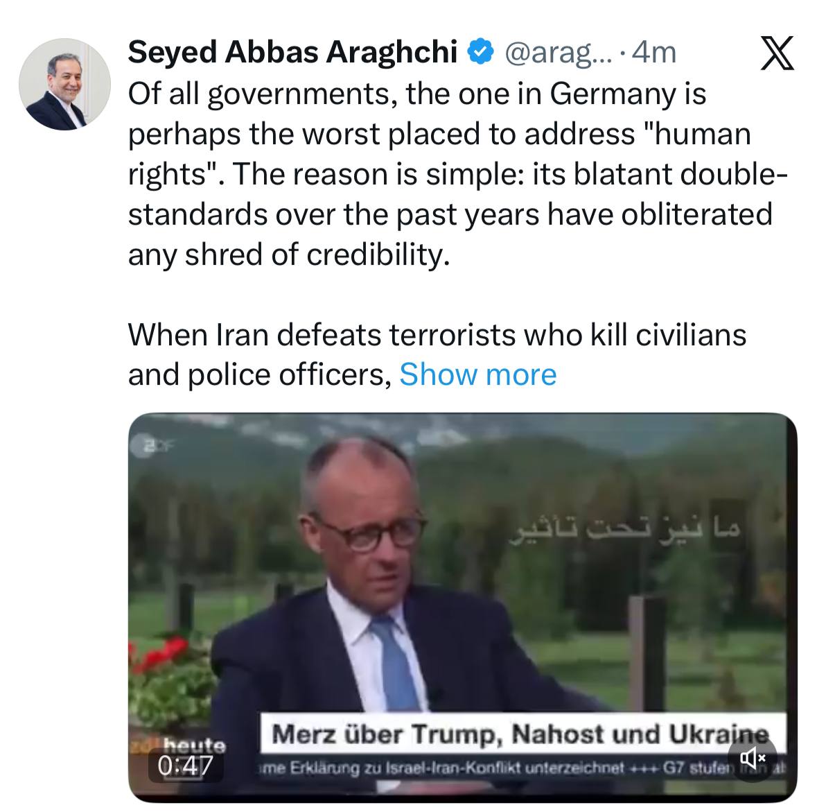 وقتی ایران تروریست‌هایی را که غیرنظامیان و افسران پلیس را می‌کشند، درهم می‌شکند، صدراعظم آلمان با عجله اعلام می‌کند که «خشونت ابراز ضعف است». پس آقای مرتس در مورد حمایت کامل خود از قتل عام ۷۰ هزار فلسطینی در غزه چه می‌گویید؟