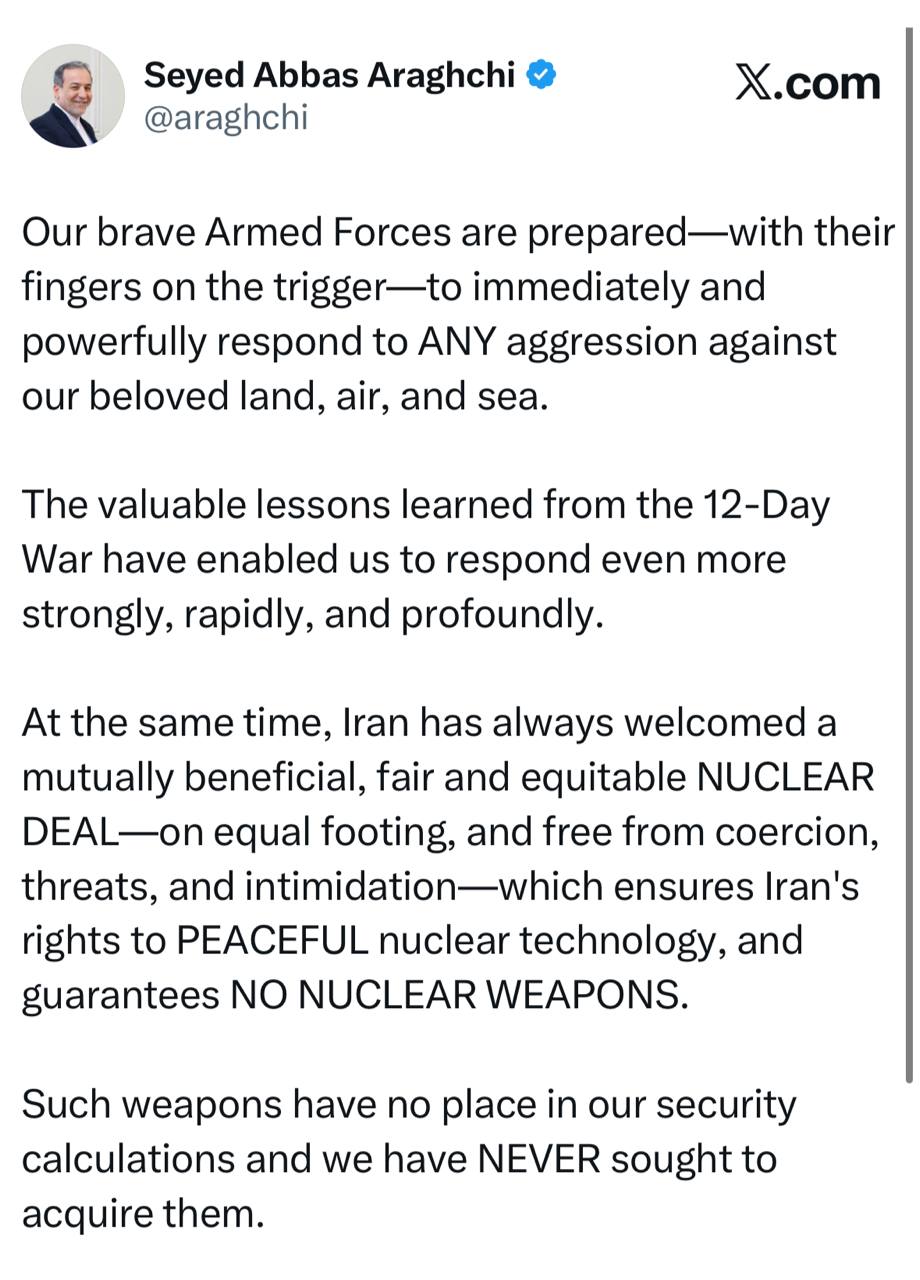 نیروهای مسلح شجاع ما با آمادگی کامل، و انگشت بر ماشه، آماده‌اند تا به‌طور سریع و قاطع به هرگونه تجاوز علیه خاک، حریم هوایی و آب‌های سرزمینی کشور عزیزمان پاسخ دهند.