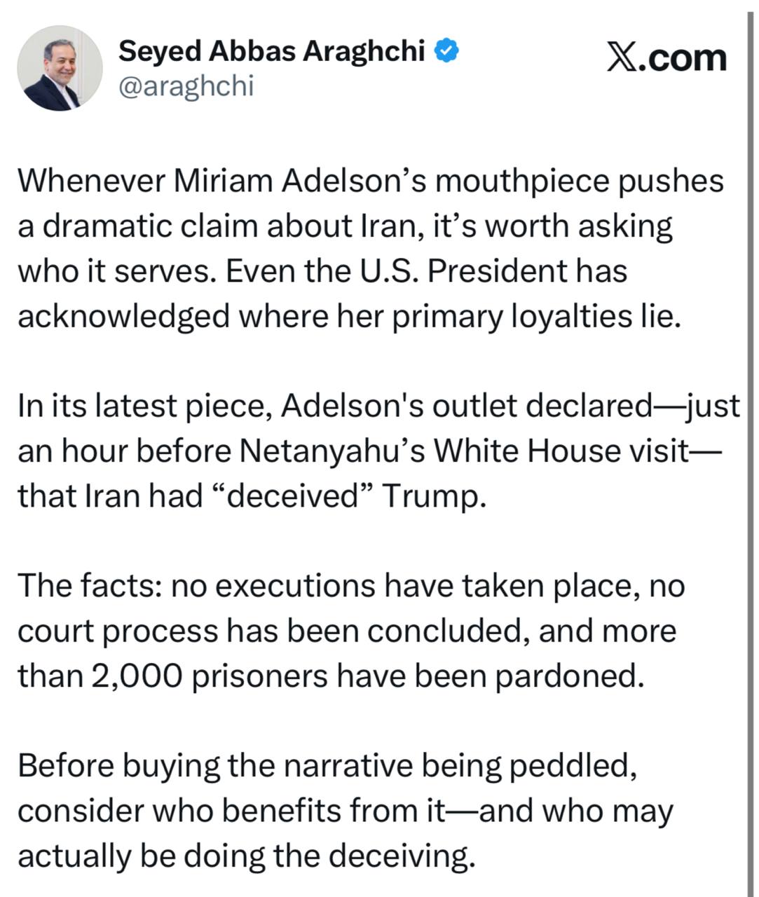 هر زمانی که رسانه وابسته به میریام ادلسون ادعایی جنجالی درباره ایران مطرح می‌کند، باید پرسید این ادعا در خدمت چه کسی است؟ حتی رئیس‌جمهور ایالات متحده نیز اذعان کرده که وفاداری‌های اصلی او نسبت به کجاست (اسرائیل).