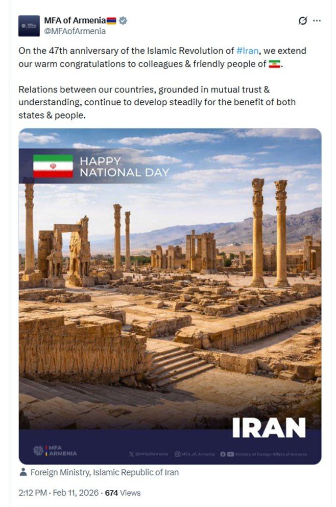 وزارت امور خارجه ارمنستان در پیام تبریکی به مناسبت سالگرد پیروزی انقلاب اسلامی و روز ملی جمهوری اسلامی ایران در صفحه خود در شبکه ایکس نوشت: