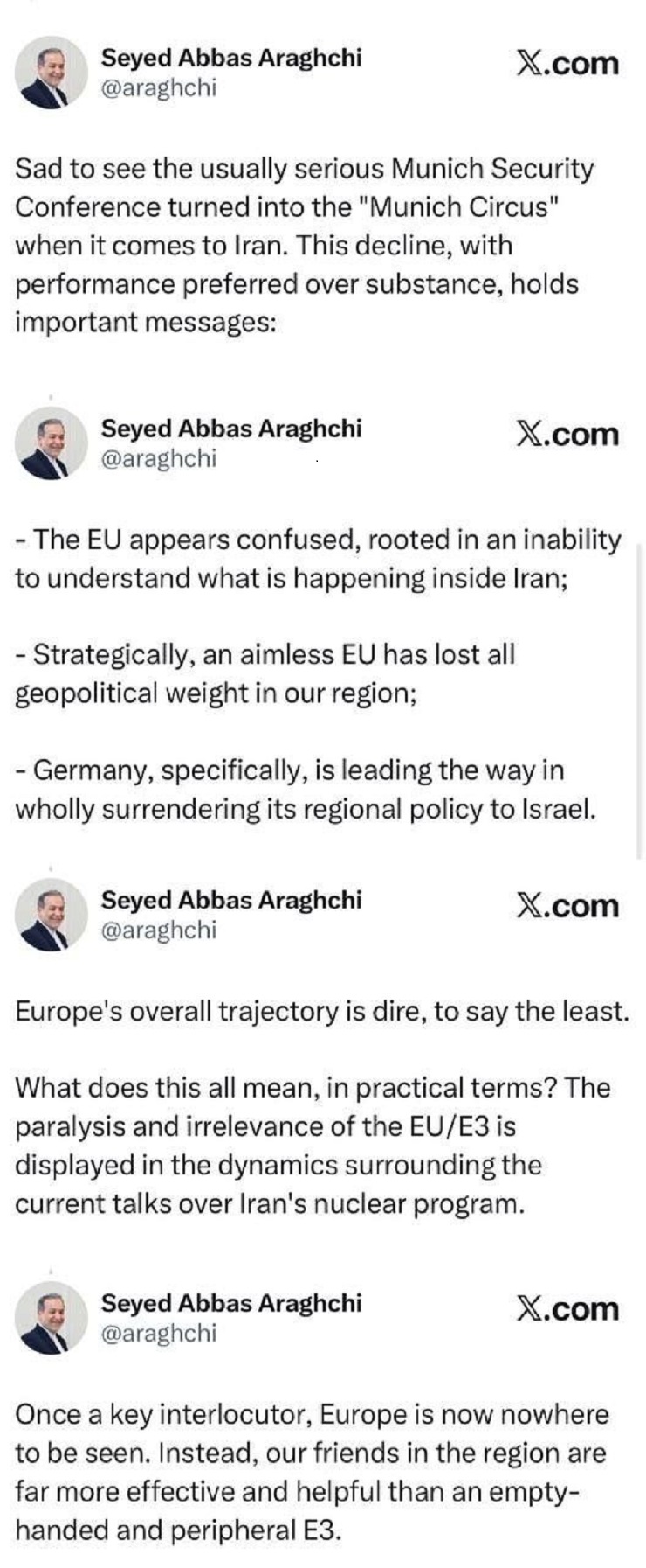 اروپا که زمانی یکی از طرف‌های اصلی گفتگو بود، اکنون اثری از آن دیده نمی‌شود. در مقابل، دوستان ما در منطقه بسیار مؤثرتر و مفیدتر از این تروئیکای اروپاییِ ناتوان و به حاشیه‌ رانده شده عمل می‌کنند.