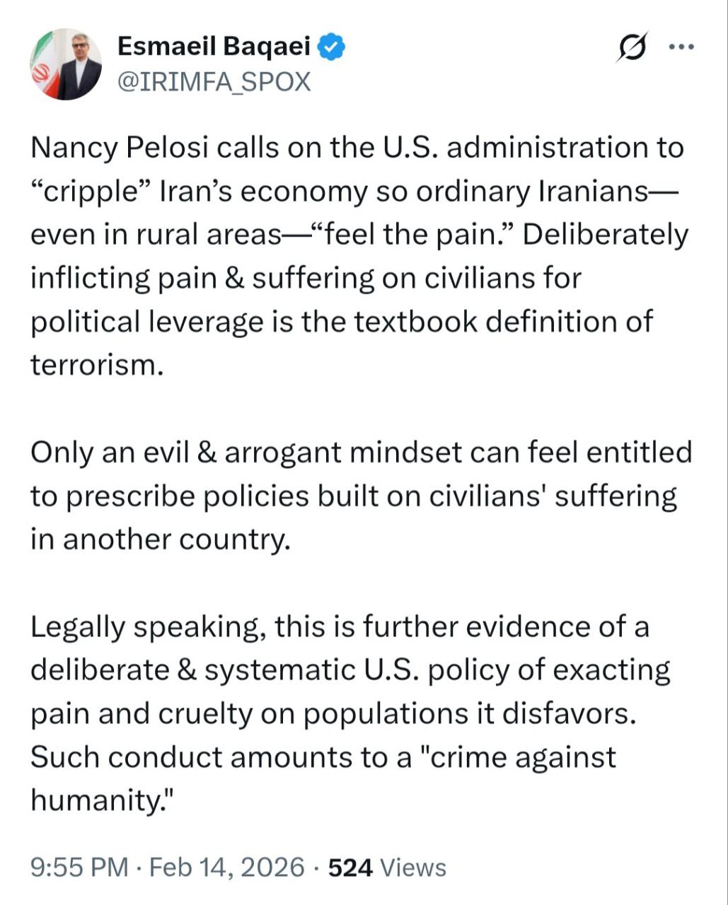 اسماعیل بقائی سخنگوی وزارت امور خارجه در واکنش به سخنان رئیس سابق مجلس نمایندگان آمریکا که دولت آمریکا را ترغیب به تشدید فشار اقتصادی بر ایران با هدف تحمیل درد و رنج بر مردم ایران کرده است، نوشت: