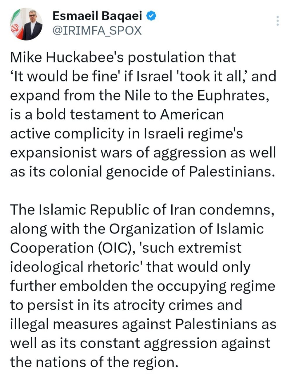 اسماعیل بقائی سخنگوی وزارت امور خارجه در پیامی در شبکه ایکس، اظهارات مایک هاکیبی سفیر آمریکا در تلآویو مبنی بر مجاز بودن تصرف سرزمینهای عربی-اسلامی «از نیل تا فرات» توسط رژیم صهیونیستی را محکوم کرد.