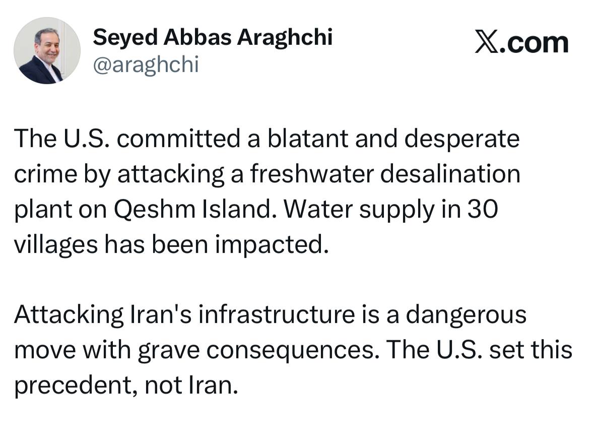 سید عباس عراقچی وزیر امور خارجه در پیامی در شبکه ایکس با اشاره به هدف قرار دادن زیرساختهای حیاتی ایران توسط متجاوزان آمریکایی نوشت:
