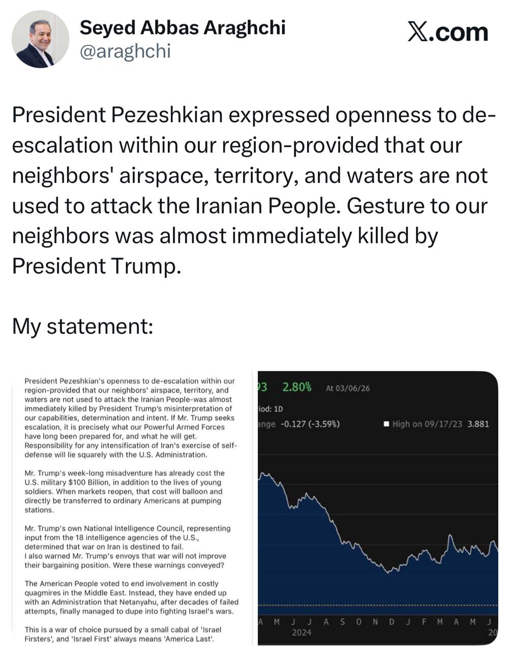 دکتر پزشکیان رئیس‌جمهور آمادگی خود را برای کاهش تنش در منطقه اعلام کرده بود، مشروط بر آنکه حریم هوایی، خاک و آب‌های همسایگان ما برای حمله به مردم ایران مورد استفاده قرار نگیرد؛ اما این رویکرد تقریباً بلافاصله به‌دلیل برداشت غلط رئیس‌جمهور ترامپ از توانایی‌ها، اراده و نیت ما نابود شد.