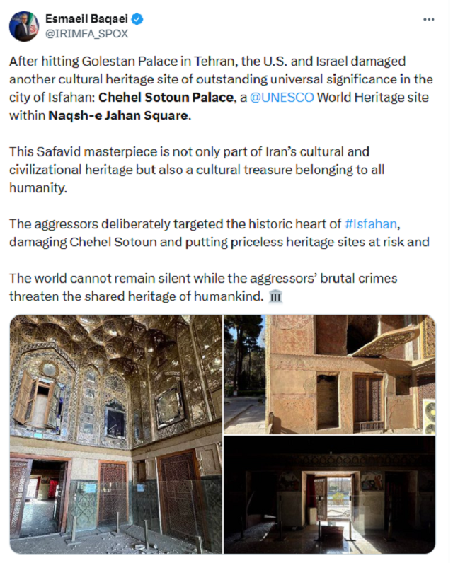 After hitting Golestan Palace in Tehran, the U.S. and Israel damaged another cultural heritage site of outstanding universal significance in the city of Isfahan: Chehel Sotoun Palace, a @UNESCO World Heritage site within Naqsh-e Jahan Square. This Safavid masterpiece is not only part of Iran’s cultural and civilizational heritage but also a cultural treasure belonging to all humanity. The aggressors deliberately targeted the historic heart of #Isfahan, damaging Chehel Sotoun and putting priceless heritage sites at risk and The world cannot remain silent while the aggressors’ brutal crimes threaten the shared heritage of humankind.