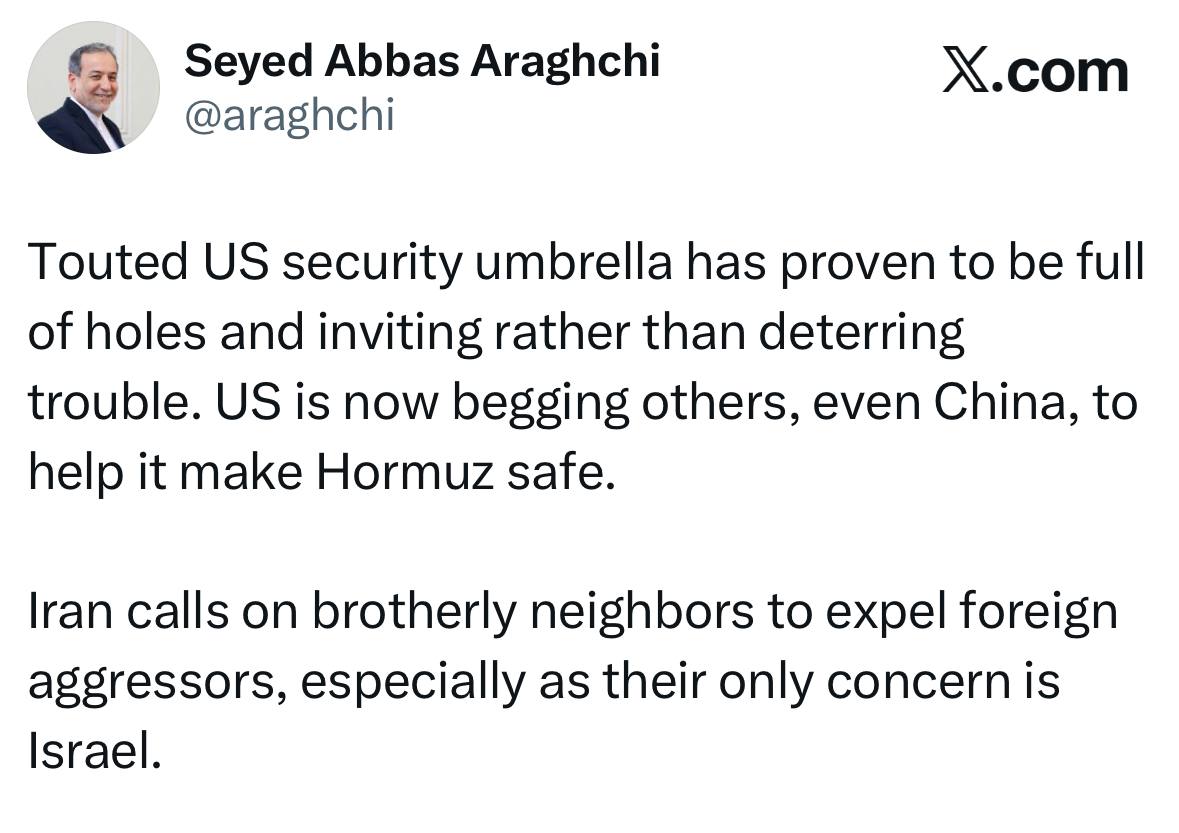 ایران از برادران همسایه خود می‌خواهد نیروهای متجاوز خارجی را از سرزمین‌هایشان بیرون کنند؛ به‌ویژه به این دلیل که تنها دغدغه و اولویت این نیروها دفاع از اسرائیل است.