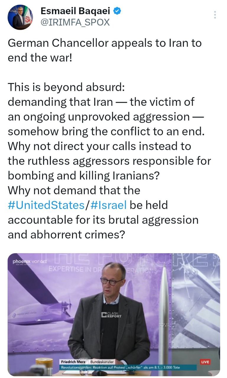اسماعیل بقایی سخنگوی وزارت امور خارجه طی پیامی در شبکه ایکس با اشاره به درخواست صدر اعظم آلمان از ایران برای پایان دادن به جنگ نوشت: