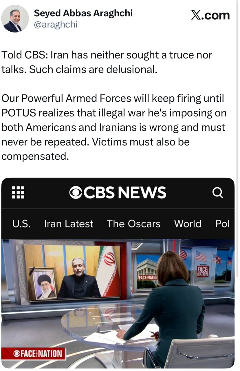 در مصاحبه با شبکه سی بی اس آمریکا گفتم: ایران نه درخواست آتش‌بس کرده و نه خواستار مذاکره شده است. چنین ادعاهایی چیزی جز توهم نیست.