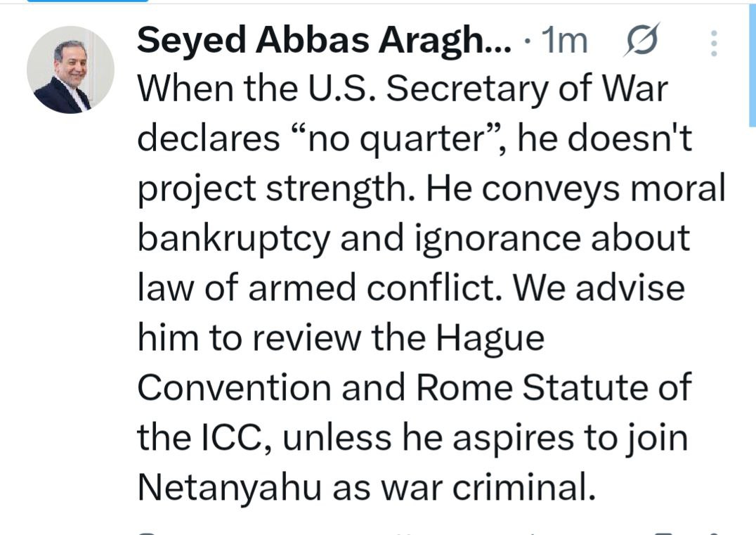 پیام سید عباس عراقچی وزیر امور خارجه کشورمان در شبکه ایکس در خصوص اظهارات وزیر جنگ آمریکا