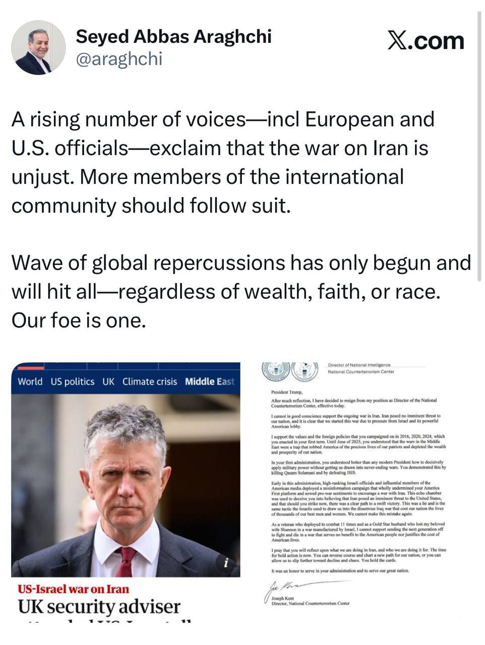 دعوت سید عباس عراقچی وزیر امور خارجه کشورمان از جامعه بین الملل برای پیوستن به کمپین نه به جنگ ناعادلانه علیه ایران؛ دشمن همه ما یکی است