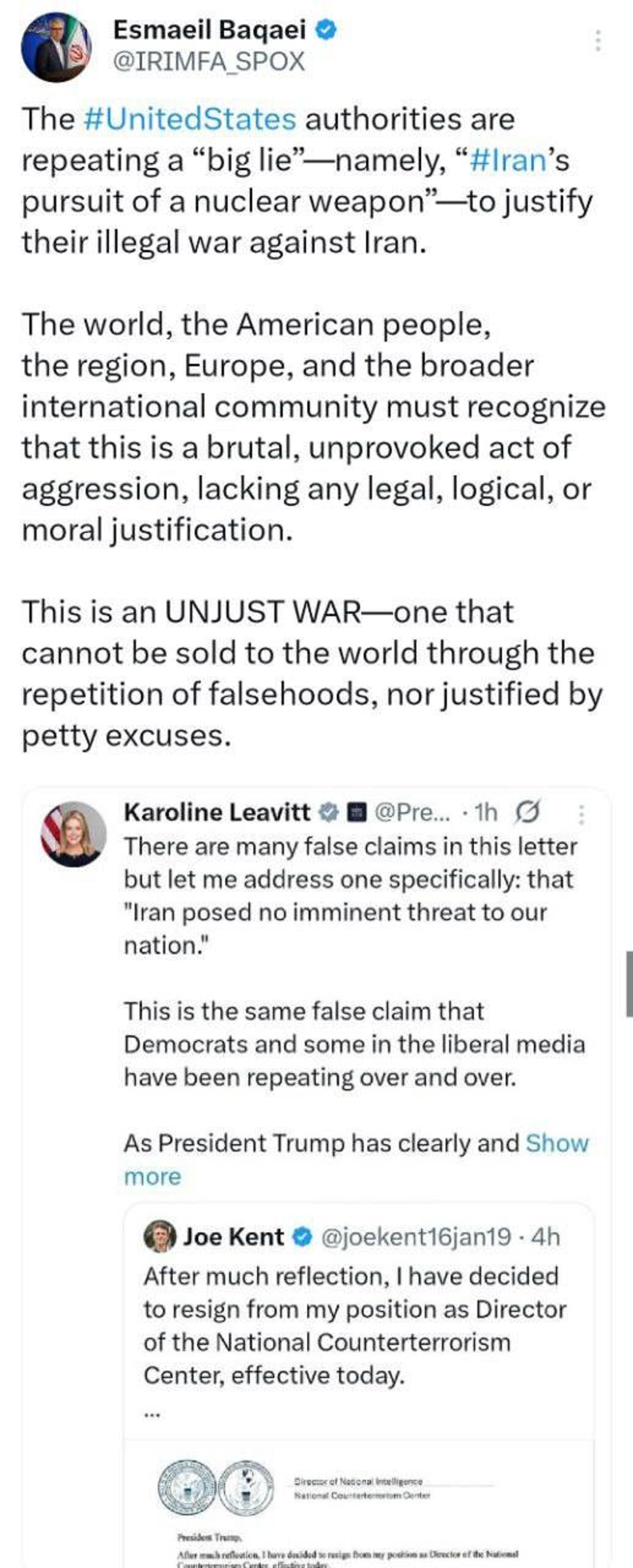 اسماعیل بقایی سخنگوی وزارت امور خارجه طی پیامی در شبکه ایکس، با اشاره به دروغ پردازی‌های مجدد سخنگوی کاخ سفید که در واکنش منفعلانه به استعفای مدیر مرکز ملی مبارزه با تروریسم آمریکا منتشر شده بود، نوشت: