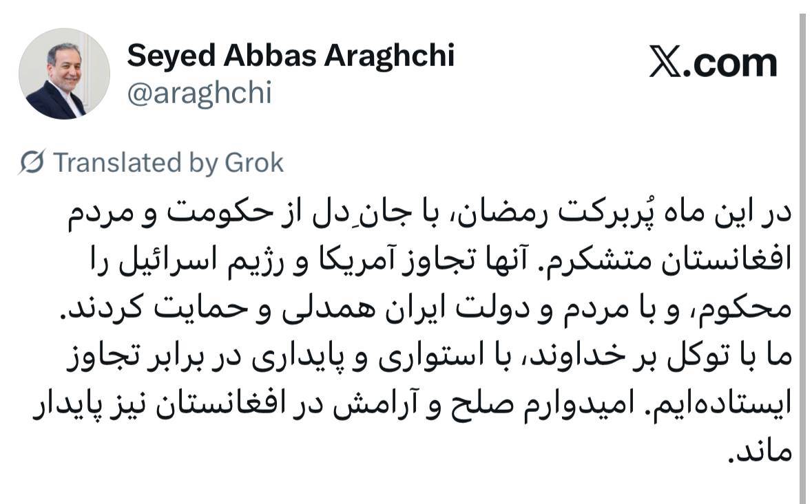 در این ماه پُربرکت رمضان، با جانِ دل از حکومت و مردم افغانستان متشکرم. آنها تجاوز آمریکا و رژیم اسرائیل را محکوم، و با مردم و دولت ایران همدلی و حمایت کردند.