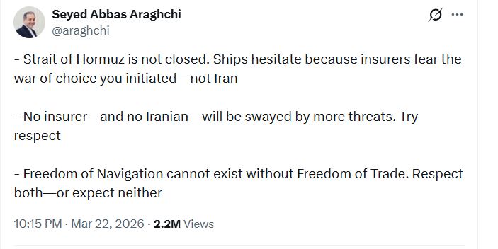 تنگه هرمز بسته نشده است. توقف کشتی‌ها به‌خاطر ترس شرکت‌های بیمه از «جنگ انتخابی» است که شما آغاز کرده‌اید، نه ایران.