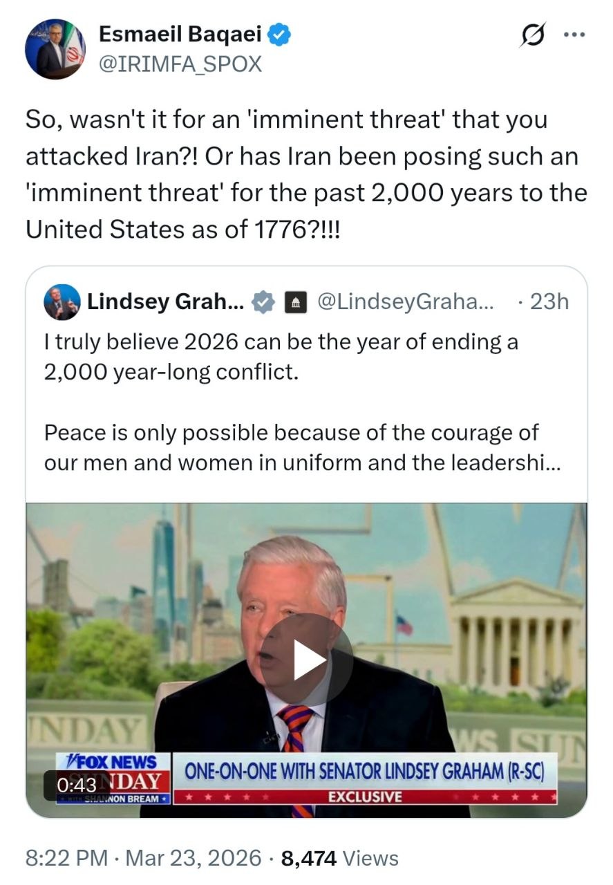 اسماعیل بقائی سخنگوی وزارت امور خارجه در واکنش به سخنان لیندسی گراهام مبنی بر اینکه سال ۲۰۲۶ می‌تواند فرصتی برای حل یک منازعه ۲۰۰۰ ساله باشد، در پیامی در شبکه ایکس نوشت: