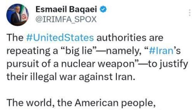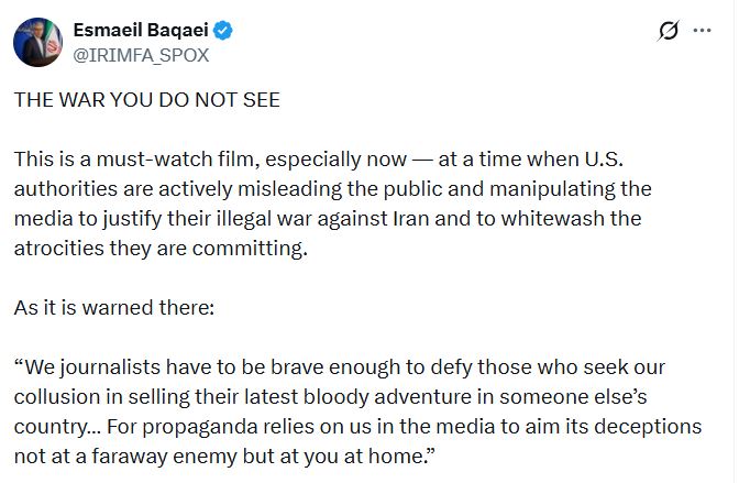 اسماعیل بقائی سخنگوی وزارت امور خارجه با انتشار پوستر مستند "جنگی که نمی‌بینید"، در شبکه ایکس نوشت: