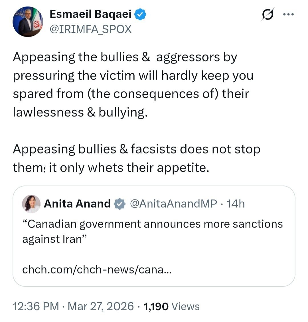 اسماعیل بقائی سخنگوی وزارت امور خارجه، در واکنش به اقدام کانادا در اعلام چند تحریم جدید علیه ایران در شبکه ایکس نوشت: