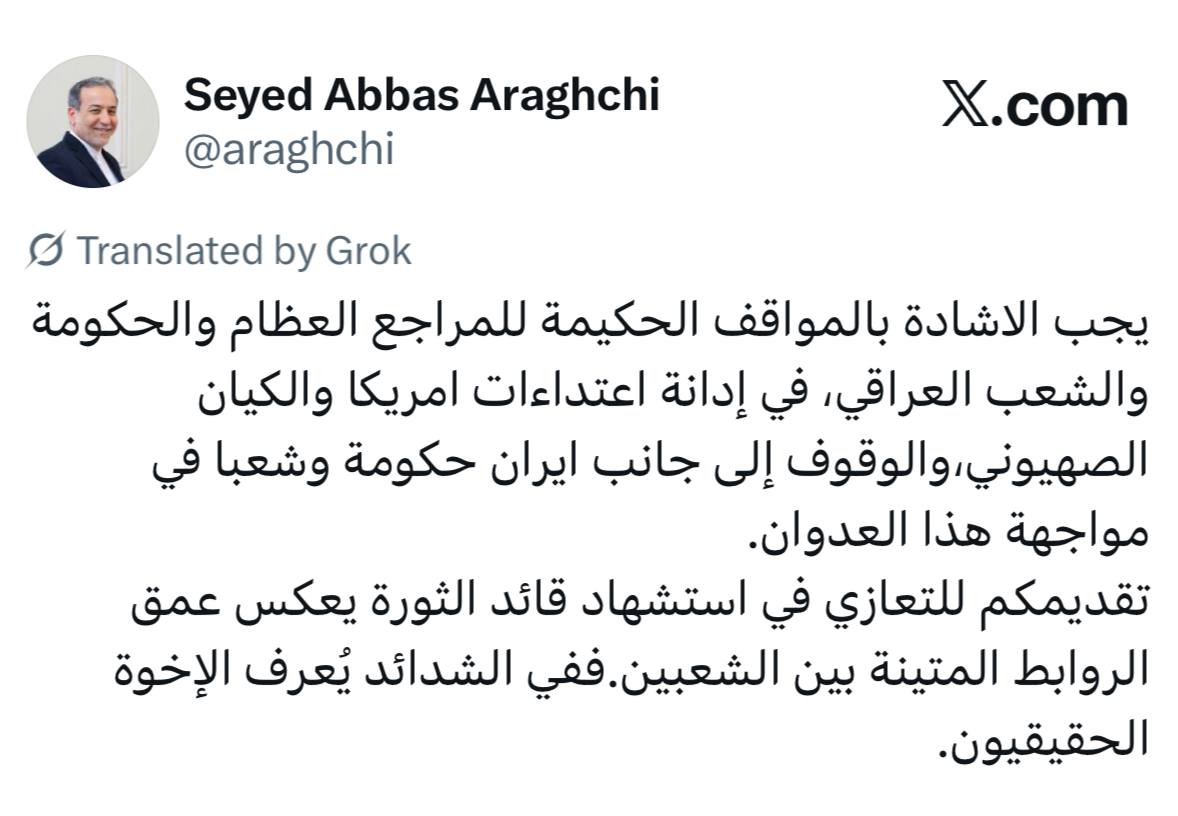 قدردانی سید عباس عراقچی وزیر خارجه از دولت و ملت و مراجع عالیقدر عراق؛ در سختی‌ها، برادران واقعی شناخته می‌شوند