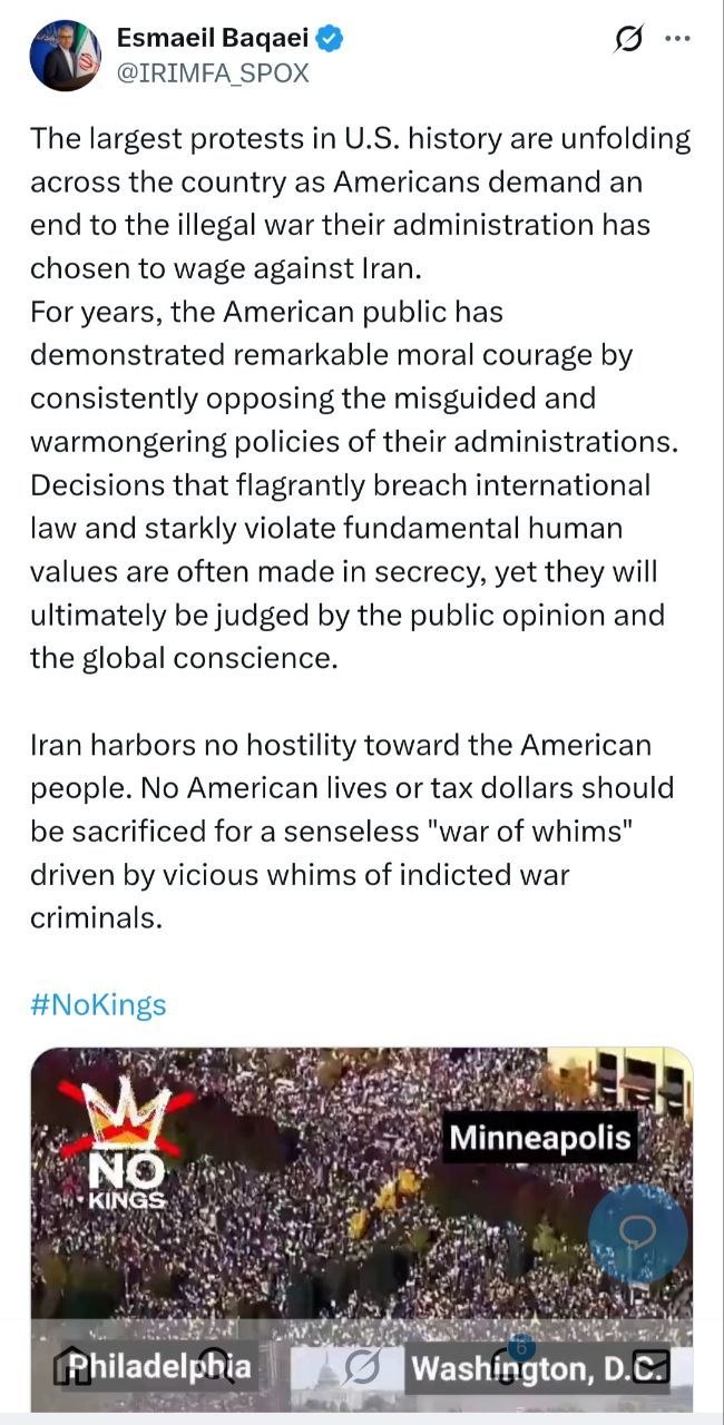اسماعیل بقائی سخنگوی وزارت امور خارجه در واکنش به تظاهراتهای گسترده در ایالتها و شهرهای مختلف آمریکا و دیگر کشورها در اعتراض به تجاوز نظامی آمریکا و رژیم صهیونیستی علیه ایران، در شبکه ایکس نوشت: