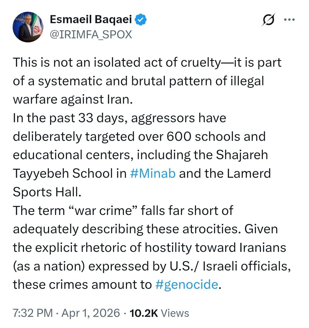 اسماعیل بقائی سخنگوی وزارت امور خارجه در واکنش به گزارش رسانه‌های آمریکایی مبنی بر استفاده آمریکا از یک موشک جدید در حمله به ورزشگاه لامرد (استان فارس) و کشتار ۲۱ ورزشکار نوجوان، در شبکه ایکس نوشت: