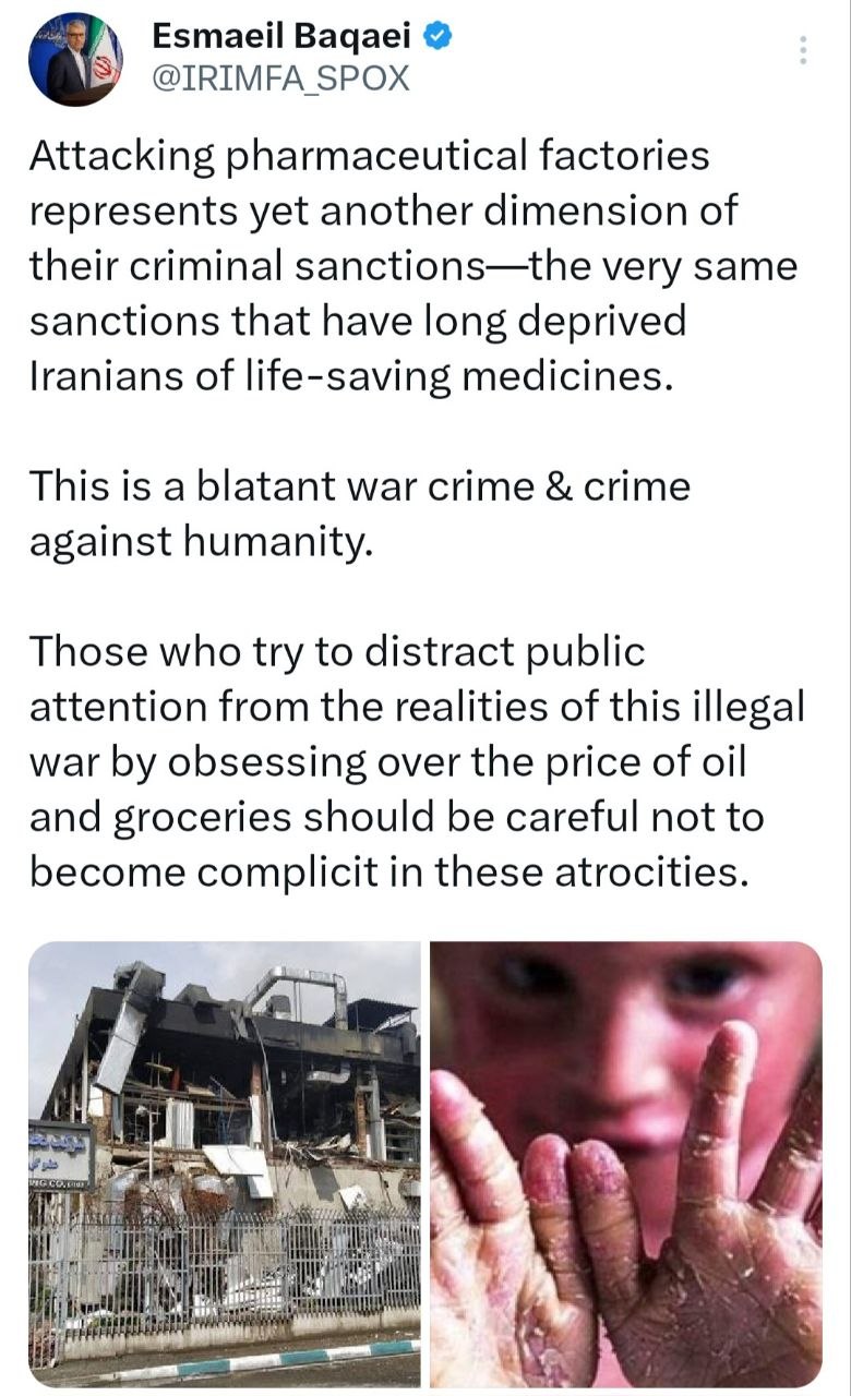 اسماعیل بقائی سخنگوی وزارت امور خارجه در پیامی در شبکه ایکس درباره حملات جنایتکارانه آمریکا و رژیم صهیونیستی به یکی از کارخانه‌های داروسازی، نوشت:
