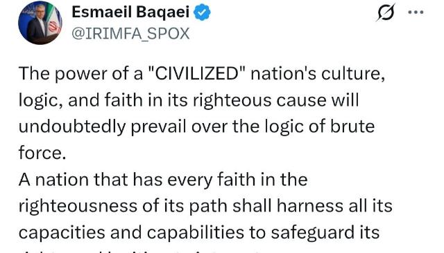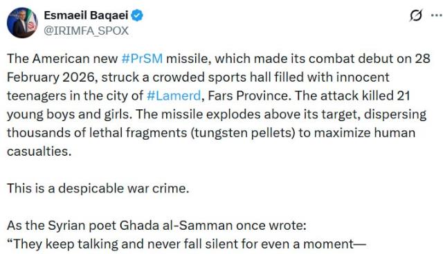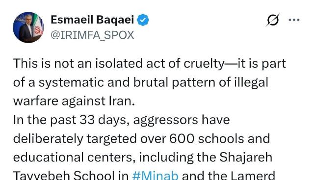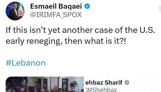 سخنگوی وزارت امور خارجه با اشاره به تعهد دولت آمریکا (در چارچوب تفاهم حاصله با ایران از طریق میانجی پاکستانی) مبنی بر اینکه لبنان نیز مشمول آتش‌بس میان ایران-آمریکا می‌باشد، خاطرنشان کرد: همانطور که نخست‌وزیر پاکستان نیز تصریح کرده است، توقف جنگ در جبهه لبنان یکی از اجزای تفاهم آتش‌بس میان ایران-آمریکا است و جنایات امروز رژیم صهیونیستی علیه لبنان نقض آشکار این تفاهم محسوب می‌شود.