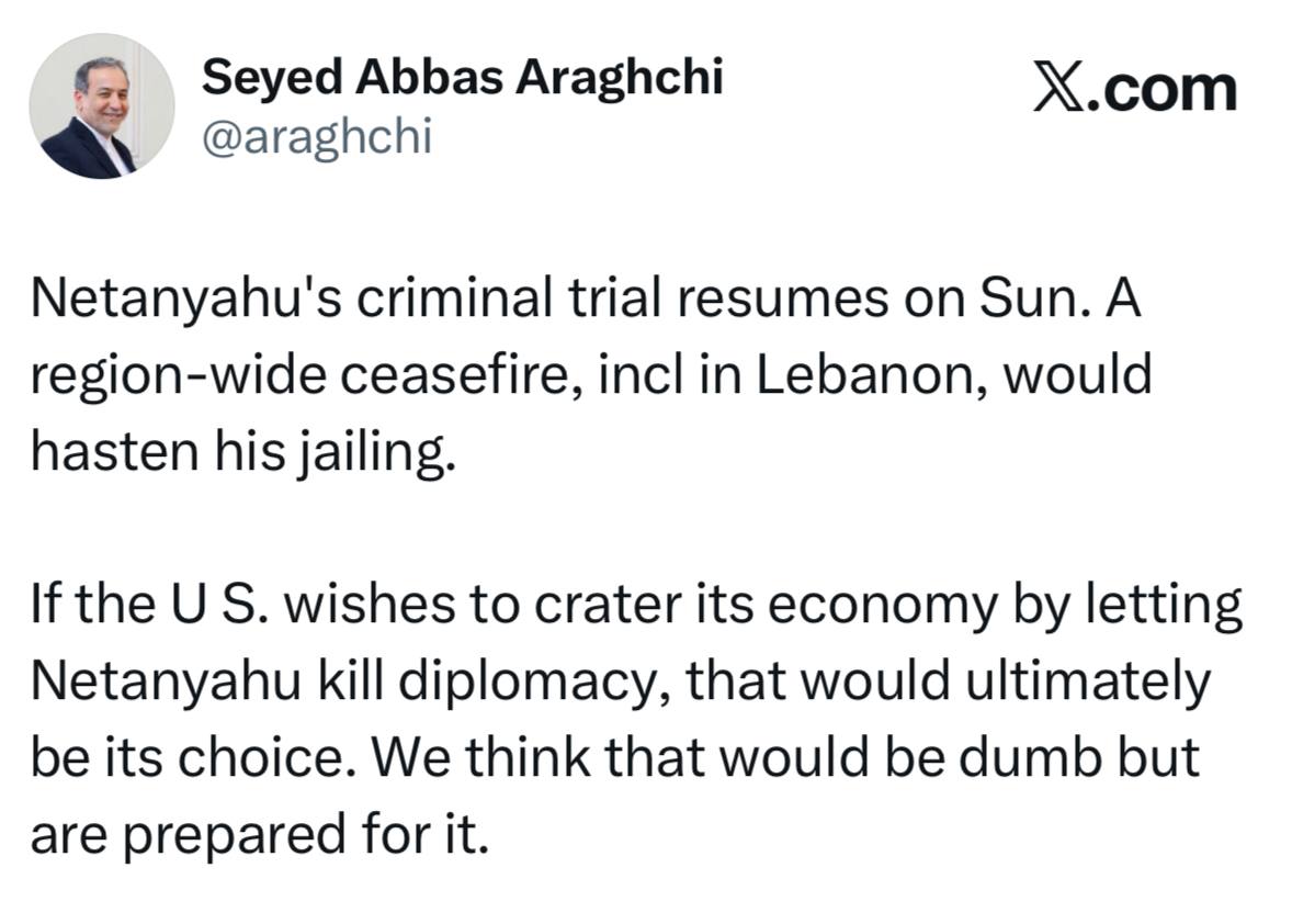 عراقچی: اگر آمریکا میخواهد با اجازه به نتانیاهو برای نابود کردن مسیر دیپلماسی، اقتصاد خود را نابود کند، ما آمادهایم!