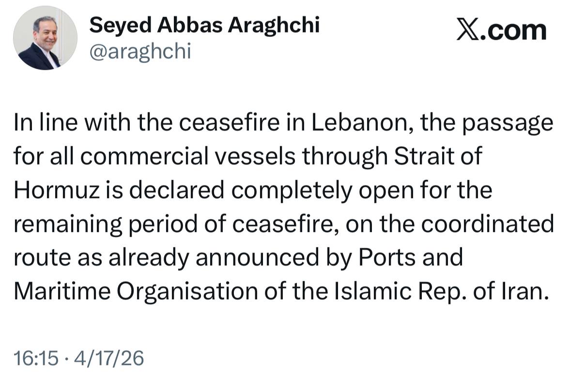 در پی اعلام آتشبس در لبنان، عبور و مرور تمامیکشتیهای تجاری از طریق تنگه هرمز برای باقیمانده دوره آتشبس بهطور کامل آزاد اعلام میشود.