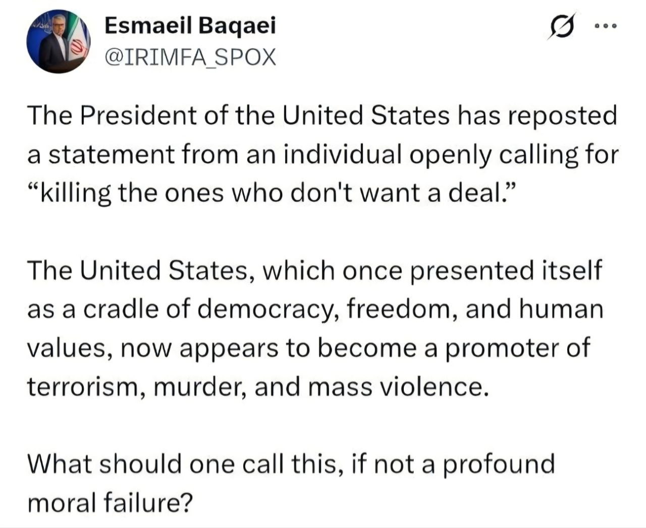 اسماعیل بقائی سخنگوی وزارت امور خارجه، در واکنش به تکرار اظهارات مقامات آمریکایی در ترغیب به ترور ایرانیان، در شبکه ایکس نوشت:
