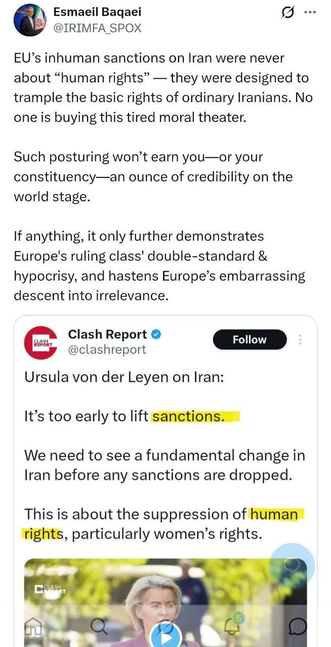 اسماعیل بقائی سخنگوی وزارت امور خارجه در واکنش به سخنان رئیس کمیسیون اروپایی که ادعا کرده است «زود است راجع به رفع تحریمهای ایران صحبت کنیم»، در شبکه ایکس نوشت: